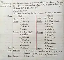 A page from the Sheffield FA handbook showing the team selection for the first ever floodlit game. The majority of players were members of the Wednesday F.C. club