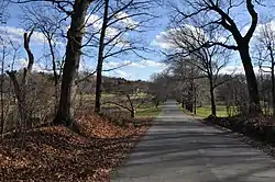 The Brandegee Estate is located astride the town line between Brookline and the Jamaica Plain neighborhood of Boston, and consists of a long strip of land whose western end is on Newton Street in Brookline, and whose eastern end is on Allandale Street in Boston. Separating most of the estate from Allandale Street to the south is Allandale Farm, the last working farm in Boston. The developed features are the main house and formal garden, near the center of the estate, and a cluster of service buildings at the eastern end, where the stables and estate office are located.[2] The stables were until recently used by the City of Boston for its mounted police force.