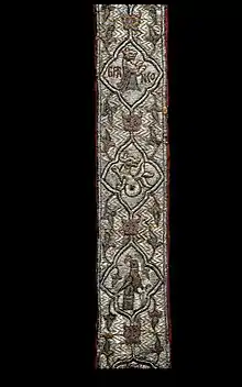 On the preserved parts of the gold embroidery called "Branko's Belt" (Brankov pojas), taken to have been ordered by Branko, a helmet with a crest of a rising lion is depicted, along with the name Branko.[18] The lion, as a motive of monarchial iconography in Serbia, appears in coinage of Stefan Dušan and Stefan Uroš V, and in an independent presentation in a seal of the latter.[19] The lion then disappears from the repertoire of Stefan Uroš V, but is maintained by the Branković family, in various forms.[19] S. Novaković found one fragment of the belt in the collection of the Russian archaeological commission.[20]