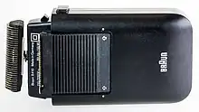 The 1950s also marked the beginning of the product that Braun is known for today: the electric shaver. The S 50 was the first electric shaver from Braun. The shaver was designed in 1938, but World War II delayed its introduction until 1951.[6] It featured an oscillating cutter block with a very thin, yet very stable steel-foil mounted above it.