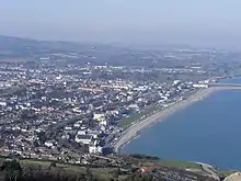 Bray (Irish: Bré [bʲɾʲeː])[2] is a coastal town in north County Wicklow, Ireland. It is situated about 20 km (12 mi) south of Dublin city centre on the east coast. It has a population of 33,512 making it the tenth largest urban area within Ireland (at the 2022 census).[1] Bray is home to Ardmore Studios, and some light industry is located in the town, with some business and retail parks on its southern periphery. Commuter links between Bray and Dublin are provided by rail, Dublin Bus and the M11 and M50 motorways. Parts of the town's northern outskirts are in County Dublin.[3]