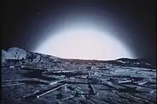 Simmonds confidently declares the situation to be under control, suggesting they draft a communiqué to the Space Commission to dispel any doubts. An exasperated Koenig tries to give the politician a reality check when the magnetic field surges off the scale. Energy discharges shoot from the open waste pits. An ever-growing chain reaction of explosions obliterates Area Two and spreads to the waste canisters strewn over the lunar surface. Only those Eagles not over the site escape destruction. In mere seconds, the entire area erupts in a colossal fireball that rocks the entire Moon.