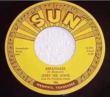 "Breathless" is a song composed by Otis Blackwell. It was the fourth record by Jerry Lee Lewis, whose version was released in February 1958 on Sun Records. It spent 15 weeks on the Billboard Hot 100 chart, peaking at #7 in April 1958.[1] The song also reached #4 on the country chart, #3 on the R&B chart, and #8 in the UK.[2] The B-side, "Down the Line", also charted in 1958, reaching #51 on the Billboard pop singles chart. It was re-released in 1979 as part of the Sun Records Golden Treasure Series as Sun #25 and on the Quality label in Canada in 1958. The song was also featured in the 1983 film Breathless starring Richard Gere and Valerie Kaprisky along with the Jerry Lee Lewis song "High School Confidential".