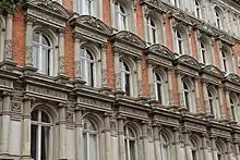 Bredgade 63–65 is designed in the Renaissance Revival style. Each of the two identical properties consists of four wings, eight bays wide towards the street, surrounding a central courtyard. The entire complex was originally five storeys tall but a recessed penthouse storey fronted by a roof-top terrace towards the street has been added. The buildings are constructed in red brick with a wealth of decorative elements in sandstone or concrete. The facade is finished by a heavy cornice supported by corbels. The windows on the first to third floors are flanked by engaged columns carrying richly decorated lintels. The windows on the second floor are topped by broken, rounded pediments while the ones on the third floor are triangular pediments. The windows on the fourth floor are flanked by pilasters. Rows of balusters are seen under the windows on the first floor. The southern corner of No. 73 is accentuated by Buttresses. The margin between No. 63 and No. 65 features two cartouches with the letter "R"—for the developer's name Rasmussen—on the second and third floor. A gateway in the two central bays of both buildings provide access to the two courtyards.[1]