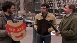 "Boom"[1] is an inner monologue sung by Bret while conversing with Coco, the attractive new sign holder. The song is performed in an electronic/dancehall style similar to that of Jamaican artist Shaggy.[3] The lyrics centre around his attraction to Coco but are distinguished by the fact that nearly all nouns are replaced by the word "boom". The accompanying video features Bret and Coco dancing in front of an animated background and has strong similarities to The Black Eyed Peas' "Hey Mama" video.[4] Also featured prominently during this sequence is a 1980s Casio DG20 digital guitar (set to mandolin).