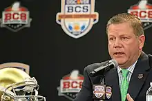 In December 2009, Kelly agreed to replace Charlie Weis as Notre Dame's head coach.[43] On December 10, Kelly announced that he had taken the position at Notre Dame.[44] He made the decision not to coach the Bearcats in the Sugar Bowl on January 1, 2010, which the Bearcats lost in a blowout to the University of Florida Gators.[45][46]