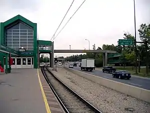 Bridgeland/Memorial station is a CTrain light rail in Calgary, Alberta. It serves the Northeast Line (Route 202). It opened on April 27, 1985, as part of the original Northeast line. The station is located in the median of Memorial Drive Northeast, 1.4 km from the City Hall Interlocking. A pedestrian overpass connects the station to both sides of Memorial Drive and stairs and escalators, as well as an elevator provide access down to the center-loading platform.