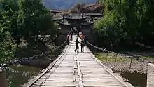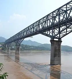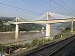 The oldest bridge still in use on the Yangtze is the Jinlong Bridge in Lijiang, a simple iron chain suspension bridge first built during the Qing dynasty from 1876 to 1880.[8] It was destroyed in a flood in 1935 and rebuilt the following year.[8] The bridge was named a National Historical Site in 2006.[8]