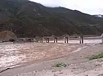 The first documented iron chain bridge across the river was built in the 7th century by the Tibetan Empire over the Jinsha. The Shenchuan Iron Bridge, a simple suspension bridge, stood at what is today Tacun of Weixi Lisu Autonomous County in the Dêqên Tibetan Autonomous Prefecture of northwestern Yunnan Province, and was probably built to help the Tibetan military advance against the Kingdom of Nanzhao during its invasions between 682 and 704.[6] The Tibetans stationed a frontier command office in the town called the Shenchuan Iron Bridge jiedushi.[6] The bridge facilitated trade between the two countries until 794 when the Nanzhao realigned with the Tang dynasty and destroyed the bridge in a war with the Tibetan Empire.[6][7]