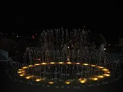 The Brindavan Gardens is a garden located 12 k.ms from the city of Mysore[1] in the Mandya District of the Indian State of Karnataka. It lies adjoining the Krishnarajasagara Dam which is built across the river Kaveri.[2] The work on laying out this garden was started in the year 1927 and completed in 1932.[3][4] Visited by close to 2 million tourists per year, the garden is one of the major attractions of Srirangapatna.[5] Sir Mirza Ismail, the Deewan of Mysore, a man with a penchant for gardens, founded the Brindavan Gardens (Krishnaraja Sagar Dam in particular) and built the Cauvery River high-level canal to irrigate 120,000 acres (490 km2) in modern Mandya district. The gardens were designed by German botanist and landscape designer Gustav Hermann Krumbiegel.