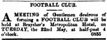 The Brisbane Football Club was formed at a meeting on 22 May 1866: the Brisbane Courier reported that "A meeting of gentlemen favorable to the formation of a Football Club in Brisbane was held on Tuesday, at Braysher's Metropolitan Hotel [formerly in Edward Street near Mary Street] ... a committee was appointed to prepare a code of rules ... The prospects of the club must be certainly very encouraging to the promoters, as already more than twenty gentlemen have joined, and a large number of others have signified their wish to do so."[4]