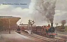 The work was brought into use on 22 May 1854.[4][17] Approaching Gloucester, the new line diverged from the GWR at Tuffley Junction on to the Tuffley Loop, which made a westerly sweep and joined the other lines from west to east at Gloucester, enabling a form of direct running. However it was not possible to run directly to the Midland Railway passenger or goods stations, which were situated as a terminus. Midland Railway trains could at last run through on the narrow gauge from Bristol to Birmingham, but they needed to back in to the station to make the passenger call. There were five new level crossings on the Tuffley Loop, and there were now four tracks, two narrow and two broad gauge, between Standish and Tuffley Junction. The work cost £150,042.[12]