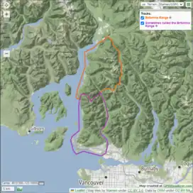 The Britannia Range is a small mountain range of the Coast Mountains that runs along the eastern shore of Howe Sound just north of Vancouver, British Columbia, Canada. It is a subrange of the Pacific Ranges and often considered part of the North Shore Mountains. The range is bounded by the Howe Sound to the west, the Stawamus River to the north, Loch Lomond on the upper Seymour River to the east, and Deeks Lake to the south.[5] However, some official maps extend the range further south of these boundaries[6] and many local sources such as hiking guidebooks will often include all of the peaks along the Howe Sound between Deeks Lake and Cypress Mountain as part of the range.[7]