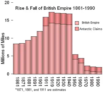 From the 16th to the 20th centuries, the British Empire stretched from a total area at its peak in 1920 to over 35,500,000 km2 (13,700,000 sq mi), the largest empire in the world.[1] In terms of population, on the eve of World War II, Britain and her colonial possessions totaled 500 million inhabitants. The British Empire had an enormous impact on world history. The United Kingdom had about 120 colonies throughout its history, the most colonies in the world, the French colonial empire came second, which had about 80 colonies.[2] Around 54 countries gained independence from the United Kingdom throughout its history, the most in the world, ahead of the French colonial empire, which 40 countries gained independence from France.[3] Over 40% of the world’s borders today, were drawn as a result of British and French imperialism.[4][5][6]