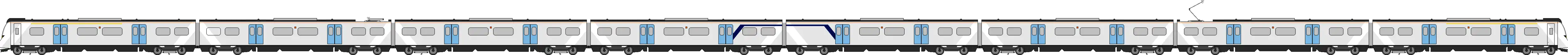 There are 60 eight-car units and 55 twelve-car units.[67] Each is a fixed length continuously gangwayed vehicle.[3] The initial livery is "light grey with pastel blue doors and a white diagonal flash at the carriage ends".[3]