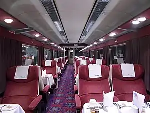 The interior of a Mark 2 Open First showing the former Virgin Trains West Coast Burgundy seat moquette trim