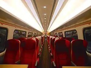 ![]() The interior of Standard Class aboard a Virgin Trains East Coast refurbished Mark 4 TSO vehicle | |