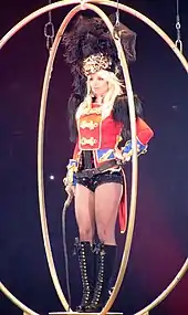 In 2009, Spears began dating agent Jason Trawick.[51] She also embarked on her Circus Tour, which was managed by her professional team including Lou Taylor, who became her business manager.[52] It was alleged that at one show Spears was "distressed" that a contact high from weed would lead her to fail a drug test, preventing her from spending time with her children; her management ultimately decided that show would continue.[53]