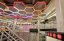 As part of the MTA Arts & Design program, Leo Villareal created a light installation called Hive in 2012.[106] It is located at the newest section of the uptown IRT platform in the mezzanine providing the transfer to the IND station.[107][108] The work consists of hexagonal lights that can change color.[107][109] The shapes used in the installation was inspired by shapes created by mathematician John Horton Conway. According to Sandra Bloodworth of MTA Arts & Design, the artwork was intended to help passengers navigate the complex; she stated in 2016 that the installation "really resonates with the activity of the station, the people waiting on the platform, this ever-changing lighting artwork".[108]