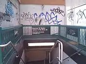 In 1979, the New York City Landmarks Preservation Commission designated the space within the boundaries of the original Bleecker Street station, excluding expansions made after 1904, as a city landmark.[5] The station was designated along with eleven others on the original IRT.[5][40] The IRT station was renovated in the late 1980s, but the renovation was delayed by one year because the project had to be redesigned to conform to landmark regulations.[41] High entry-exit turnstiles were added at the Bleecker Street entrance to the southbound platform in 1998. The previous turnstiles at that entrance, which had dated from the 1930s, often malfunctioned and did not allow passengers to enter.[42] The Bleecker Street station's original interiors were listed on the National Register of Historic Places in 2004.[16]