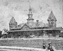The railroad became the Old Colony and Newport Railroad in 1863, and finally the Old Colony Railroad in 1872.[6] A new Victorian-style station was built in 1873–74 at Church Street on the west side of the tracks.[12][13][14] The town was renamed Brockton in 1874, with the railroad station changing its name on May 7.[5][15] The railroad was a key part of the town's burgeoning shoe industry and rapid growth, which caused Brockton's population to double from 1877 to 1887.[16] A new freight house was built in 1881.[17]