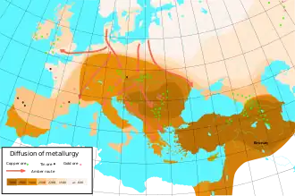 Diffusion of metallurgy in Europe and Asia Minor—the darkest areas are the oldest.
