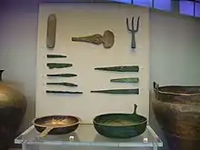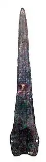 It is known that Middle Minoan bronze work flourished as an independent native art. To the very beginning of this epoch belongs the largest sword of the age, found in the palace of Malia. It is a flat blade, 79 cm long, with a broad base and a sharp point; there is a gold and crystal hilt but no ornament on the blade. A dagger of somewhat later date, now in the Metropolitan Museum of New York is the earliest piece of decorated bronze from Crete. Both sides of the blade are engraved with drawings: bulls fighting and a man hunting boars in a thicket. Slightly later again (MM III) are a series of blades from mainland Greece, which must be attributed to Cretan craftsmen, with ornament in relief, or incised, or inlaid with gold, silver and niello. The most elaborate inlays, pictures of men hunting lions and cats hunting birds, are on daggers from the shaftgraves of Mycenae. These large designs cover the whole of the flat blade except its edge, but on swords, best represented by finds at Knossos, the ornament is restricted to the high midribs which are an essential feature of the longer blades. The type belongs to the beginning of the Late Minoan (Mycenaean) age. The hilt is made in one piece with the blade; it has a horned guard, a flanged edge for holding grip-scales, and a tang for a pommel. The scales were ivory or some other perishable substance and were fixed with bronze rivets; the pommels were often made of crystal. A rapier from Zapher Papoura (Knossos) is 91.3 cm long; its midrib and hilt-flange are engraved with bands of spiral coils, and its rivet-heads (originally gold-cased) with whorls. Ordinary Mycenaean blades are enriched with narrow mouldings, parallel to the midribs of swords and daggers, or to the curved backs of one-edged knives. The spearheads have hammered sockets. Other tools and implements are oval two-edged knives, square-ended razors, cleavers, chisels, hammers, axes, mattocks, ploughshares and saws. Cycladic and mainland Greek (Helladic) weapons show no ornament but include some novel types. A tanged spearhead has a slit (Cycladic) or slipped (Helladic) blade for securing the shaft; and the halberd, a west European weapon, was in use in the Middle Helladic Greece. There are few remains of Mycenaean metal armour; a plain cheek-piece from a helmet comes from Ialysos in Rhodes, and a pair of greaves from Enkomi in Cyprus. One of the greaves has wire riveted to its edge for fastening.[1]