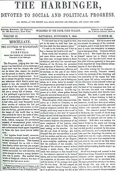 In the last few months of 1844, Brook Farmers were offered the chance to take over two Associationism-inspired publications, Brisbane's The Phalanx and John Allen's The Social Reformer. Four printers were part of Brook Farm at the time and members of the community believed it would elevate their status as leaders of the movement, as well as provide additional income.[35] Ultimately, the Brook Farmers published a new journal combining the two, The Harbinger.[28] The journal's first issue was published on June 14, 1845, and it was continuously printed, originally weekly, until October 1847, when it relocated to New York City, still under the oversight of Ripley and fellow Brook Farmer Charles Anderson Dana.[36] Naming the publication turned out to be a difficult task. Parke Godwin offered advice when it was suggested to keep the name The Phalanx: