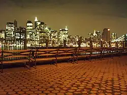 The Brooklyn Heights Promenade, also called the Esplanade,[1] is a 1,826-foot (557 m)-long platform and pedestrian walkway cantilevered over the Brooklyn-Queens Expressway (Interstate 278) in Brooklyn Heights, Brooklyn, New York City, United States. With views of Lower Manhattan's skyline and the New York Harbor, it came about as the byproduct of competing proposals for the highway's route that were resolved in the midst of World War II. Actual construction came after the war. As a structure built over a roadway, the Promenade is owned by the NYCDOT and is not considered a park; however, NYC Parks maintains the entire Promenade.[2]