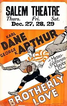 Brotherly Love is a 1928 part-silent, part-talkie comedy film produced and distributed by MGM and directed by Charles Reisner. It is a starring vehicle for the comedy team of Karl Dane and George K. Arthur. Young Jean Arthur supports the comedy duo. While essentially a silent film, the movie had music with sound effects and talking sequences.[1][2]
