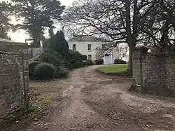 The service block to the house, dating from the mid-18th century, forms its earliest part.[1] The Nicholas family, which owned the house from its construction, added a large villa at right angles to the service wing in the early 19th century. Joseph Bradney, in the Skenfrith volume of his multi-part A History of Monmouthshire from the Coming of the Normans into Wales down to the Present Time, records the house being owned at this time by a Dr. George Nicholas, and subsequently his son, Francis. Owners of a school in Ealing, they used Brynderi "as an occasional residence to which they used to resort in the holidays".[2] Its name was changed to Belmont in the early 19th century, reverting to Brynderi on its purchase by a Colonel Clifford in 1854.[2] The house was subsequently sold to the Jackson (later Mather Jackson) family of Llantilio Court, who used Brynderi as the dower house for the estate.[1] Further extensions to the house were undertaken in 1895. The Gwent County Archive records the occupant in 1916 as "Gertrude Elizabeth Mather Jackson of Brynderi, near Abergavenny, spinster".[3] The house is constructed in a Regency style, which is uncommon in Monmouthshire and the architect of the villa is unknown. The architect of the 1895 extension was A. E. Johnson of Abergavenny.[1] Of stucco, the house is of two-storeys with attics and a Welsh slate roof. The porch is in a Doric style and the wrought-iron veranda is original. The staircase hall, and much of the interior, is largely intact.[4] It remains a private residence and is a Grade II* listed building.[1] Unusually for a building with such listed status, Brynderi is not mentioned in John Newman's Monmouthshire volume of the Pevsner Buildings of Wales.[lower-alpha 1][5]