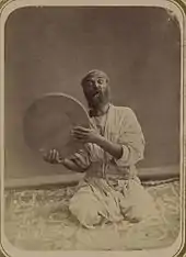 A daf (دف) is a large-sized tambourine or Perso-Arabic frame drum used to accompany both popular and classical music in Iran, Azerbaijan, the Arab world, Turkey (where it is called tef), Uzbekistan (where it is called childirma), the Indian subcontinent (where it is known as the dafli) and Turkmenistan. Daf typically indicates the beat and tempo of the music being played, thus acts like the conductor in the monophonic oriental music. The Persian poet Rudaki, who widely used names of the musical instruments in his poems, mentions the daf and the tambourine (taboorak) in a Ruba'i: A common use of tambourine (Daf) is by Albanians. They are often played by women and bridesmaids in wedding cases to lead the ceremony when bride walks down the aisle.