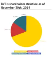 Since 2010, Bucharest Stock Exchange is listed on its own market, with a symbol BVB. Bucharest Stock Exchange has a single class of common shares and a capital of 76,741,980 lei divided in 7,674,198 shares with a nominal value of RON 10 per share. All the shares are fully paid. The free float of BVB shares is equal 100%. In accordance with the provisions of the Government Emergency Ordinance no. 90/2014 amending and supplementing the Law no. 297/2004 regarding the capital market, a shareholder of a market operator cannot own directly or indirectly more than 20% of the total voting rights. As of November 30, 2014, the Romanian legal entities constituted the largest group of the BVB shareholders (69.19%), followed by foreign legal entities (15.47%), Romanian private individuals (14.79%), and foreign private individuals (0.54%). In November 2014, European Bank for Reconstruction and Development has acquired 4.99% stake in the Bucharest Stock Exchange.[16]