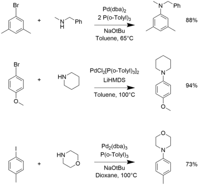 - ↑ Widenhoefer, R.A.; Buchwald, S.L. (1996), "Halide and Amine Influence in the Equilibrium Formation of Palladium Tris(o-tolyl)phosphine Mono(amine) Complexes from Palladium Aryl Halide Dimers", Organometallics, 15 (12): 2755–2763, doi:10.1021/om9509608