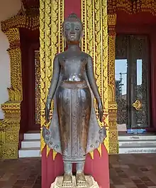 Historically, the Lao state is regarded as beginning in 1353 CE with the coronation of Fa Ngum at Luang Prabang.[8] According to local historiography, Fa Ngum brought his Khmer Theravada teacher with him to act as adviser and head priest of the new kingdom. This Khmer monk named Phramaha Pasaman also brought to the kingdom a revered image of the Buddha that became known as the Phra Bang, the namesake of the city of Luang Prabang and the symbol of the Lao kingdom.[8] However, Michel Lorrillard asserts the "complete artificial nature of this narrative" and is rather critical of the historical value of the Fa Ngum story.[9] He instead emphasizes the influence of Buddhism from Chiang Mai. Subsequent alliances with Burma and Thailand helped cement the primacy of Theravada Buddhism in the Laotian kingdom. As attested in inscriptions, King Photisarath (1501–1547) tried to suppress the worship of spirits and further Buddhicize the population. However, the "animistic" elements of Lao Buddhism have over time survived all purification efforts and are still today of crucial importance.[10] Local spirit cults and rituals associated with indigenous ideas of "soul substance" (khwan) are in most cases seamlessly integrated into Buddhism, and practitioners rarely see them as contradictive. Faced with rugged, isolating geography and the absence of a strong central government, Theravada Buddhism became one of the primary unifying features of Lao culture.[8][11] This is also attested by the fact laws for governing the monastic order have been an important part of Buddhist statecraft in pre-modern, but also colonial Laos.[12]