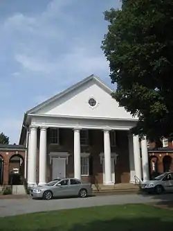 The Buffalo Presbyterian Church and Cemetery in Greensboro, Guilford County, North Carolina, United States, is a historic Presbyterian church complex and cemetery located at 800 and 803 Sixteenth Street in Greensboro. The Federal-style church sanctuary was built in 1827, and updated and expanded in 1919–1920 in the Colonial Revival style by architect Harry Barton (1876-1937). It was expanded again in 1956. Flanking the sanctuary are two-story Colonial Revival-style educational buildings linked to it by one-story arcades. The rectangular two-story Colonial Revival-style manse and garage were added to the complex in 1924. The church cemetery has burials dating back to 1775.[2]