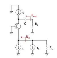 Figure 6 shows a bipolar current buffer biased with a current source (designated IE for DC emitter current) and driving another DC current source as active load (designated IC for DC collector current). The AC input signal current iin is applied to the emitter node of the transistor by an AC Norton current source with Norton resistance RS. The AC output current iout is delivered by the buffer via a large coupling capacitor to load RL. This coupling capacitor is large enough to be a short circuit at frequencies of interest.
