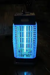Battery-powered bug zappers are manufactured, often in the shape of a tennis racket, with which flying insects can be hit.[10] Low-cost versions may use a standard disposable battery, while rechargeable bug zappers may use a lithium ion battery.[11]
