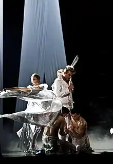 The Bulgarian performance featured Miro performing in a white leather suit, joined on stage by two female dancers wearing angel wings and two male dancers. The stage featured silver drapes which retracted to reveal white flashing lights in the background that transitioned to orange lighting during the chorus. The performance also featured the use of smoke effects.[25][26] The choreography for the Bulgarian performance was developed by British director Venol King.[20] Among the four dancers that joined Miro were Aleksandar Boychev, Eli Radanova and Vyara Panteleeva. The backing performers were chosen by BNT together with the singer during an audition held in February 2010.[27]