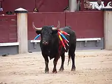 The bull then enters the ring to be tested for aggressiveness by the matador and banderilleros with the magenta and gold capote (dress cape).[22] Bulls are raised on the open range by specialist breeding estates called ganadería. The bull enters the arena with a rosette on its back bearing the colours of the estate of its origin.[23]