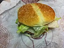 As part of the forty-fifth anniversary of its Whopper sandwich in 2002, BK introduced an updated version of the sandwich called the Chicken Whopper and added a smaller version called the Chicken Whopper Jr. sandwich, along with a new Caesar salad sandwich topped with a Chicken Whopper filet.[11][12][13] The introduction of the Chicken Whopper represented the company's first move to extend the Whopper brand name beyond beef-based sandwiches since the original Whopper's introduction in the 1950s.[14] The sandwiches featured a whole chicken breast filet, weighing either 4.7 oz (130 g) for the larger sandwich and a 3.1 oz (88 g) for the Jr., mayonnaise, lettuce, and tomato on a sesame seed roll.[15] A newly reformulated low fat mayonnaise was introduced in conjunction with the new sandwiches.[16] Along with the company's new BK Veggie sandwich, The Chicken Whopper Jr. version of the sandwich was lauded by the Center for Science in the Public Interest as being one of the best nutritionally sound products sold by a fast food chain. Still, the CSPI decried the rest of the Burger King menu as being vastly unhealthy.[17]