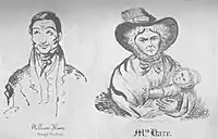 William Hare was probably born in County Armagh, County Londonderry or in Newry. His age and year of birth are unknown; when arrested in 1828 he gave his age as 21, but one source states that he was born between 1792 and 1804.[19][23] Information on his earlier life is scant, although it is possible that he worked in Ireland as an agricultural labourer before travelling to Britain. He worked on the Union Canal for seven years before moving to Edinburgh in the mid-1820s, where he worked as a coal man's assistant.[19][23] He lodged at Tanner's Close, in the house of a man named Logue and his wife, Margaret Laird, in the nearby West Port area of the town. When Logue died in 1826, Hare may have married Margaret.[lower-alpha 2] Based on contemporary accounts, Brian Bailey in his history of the murders describes Hare as "illiterate and uncouth—a lean, quarrelsome, violent and amoral character with the scars from old wounds about his head and brow".[3] Bailey describes Margaret, who was also an Irish immigrant, as a "hard-featured and debauched virago".[24]