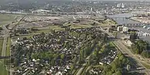 Burkeville (foreground) viewed from a plane departing Vancouver International Airport.