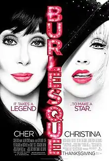Burlesque is a 2010 American backstage musical film written and directed by Steven Antin. It stars Cher, Christina Aguilera, Kristen Bell, Cam Gigandet, Stanley Tucci, Julianne Hough, Alan Cumming, and Peter Gallagher, and features cameos from Dianna Agron, and James Brolin. The film tells the story of Ali (Aguilera), an aspiring singer who leaves her small hometown for Los Angeles, where she becomes a dancer at a struggling burlesque lounge owned by Tess (Cher). After a performance is sabotaged by her rival, Nikki (Bell), Ali sings the song herself, impressing Tess and leading to her becoming the main attraction of the lounge. Burlesque marks Aguilera's first leading role, as well as Cher's first musical performance on screen.
