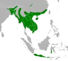 The Burmese python occurs throughout Southern and Southeast Asia, including eastern India, southeastern Nepal, western Bhutan, southeastern Bangladesh, Myanmar, Thailand, Laos, Cambodia, Vietnam, northern continental Malaysia, and southern China in Fujian, Jiangxi, Guangdong, Hainan, Guangxi, and Yunnan.[21] It also occurs in Hong Kong, and in Indonesia on Java, southern Sulawesi, Bali, and Sumbawa.[22] It has also been reported in Kinmen.[23]