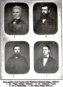 The second most influential man in Winchester was arguably Hugh Holmes McGuire (1801–1875), founder of the Winchester Medical College; he was certainly the most distinguished doctor in northern Virginia. "Although well advanced in years [he was 60], Dr. McGuire was with the cause so heartily that he accepted a commission as surgeon in the Confederate Army, and had charge of the hospitals at Greenwood and Lexington."[20]