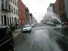 Newspapers around the country published UPI and the Associated Press's photos of Bushwick residents with stolen items and a police officer beating a suspected looter, and Bushwick became known for riots and looting.[52] Fires spread to many residential buildings as well. After the riots were over and the fires were put out, residents saw unsafe dwellings and empty lots among surviving buildings, leading one author to describe the scene as "some streets that looked like Brooklyn Heights, and others that looked like Dresden in 1945":[51]: 181 The business vacancy rate on Broadway reached 43% in the wake of the riots.[47]