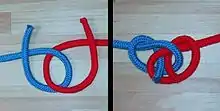 The butterfly bend is a knot used to join the ends of two ropes together. It is the analogous bend form of the butterfly loop,[1] in that it is the butterfly loop with the loop cut.[2] The observation that the butterfly loop is secure enough to isolate a worn or damaged section of rope within the loop indicated that the bend form of the knot would be similarly secure.[3]