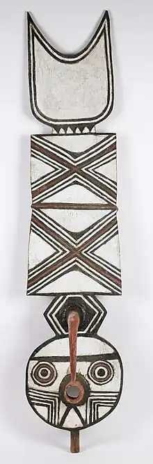 In particular the Southern Bwa are known for their tall plank masks, known as nwantantay, and tend to use wood to make their masks.[4][3] This is a result of their adoption of Nuna religion and their traditions of using wooden masks.[4] The religion associated with wooden masks is focused on the spirit Lanle, whose power is manifested through the wooden masks. Nwantantay can also be made of polychrome by the blacksmiths. Built in horizontal shapes, these masks can represent different animals and have specific designs. For example, a butterfly mask would have concentric circles, while a hawk mask would have a plain white surface. these masks are worn for female entertainment.[12]