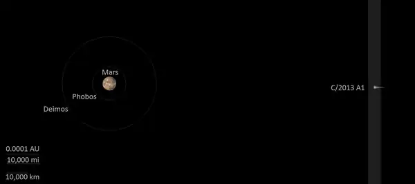 C/2013 A1 passed the planet Mars very closely on 19 October 2014, at a distance of 140,496.6 ± 4.0 km (87,300.5 ± 2.5 mi; 0.000939162 ± 2.7×10−8 au).[7] After its discovery, there was thought to be a chance of a collision with Mars, but this possibility was excluded when its orbit was determined with about a 200 day observation arc.[8]